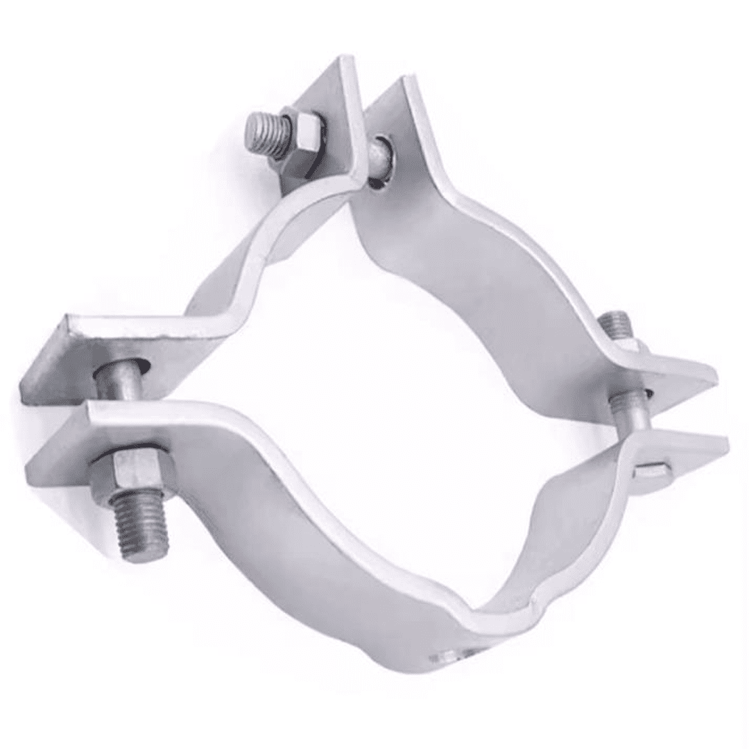 sirve como punto de acople para fijar otros herrajes o estructuras a un poste, consiste en bandas ajustables con pernos para asegurar tuberías, cables o accesorios.